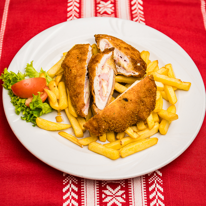 Rántott csirkemell sonkával, sajttal töltve hasábburgonyával