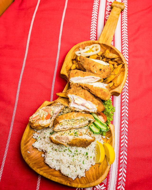 „Billentyűs” csirkemell: rántva, sonkával, sajttal töltve, párolt rizzsel